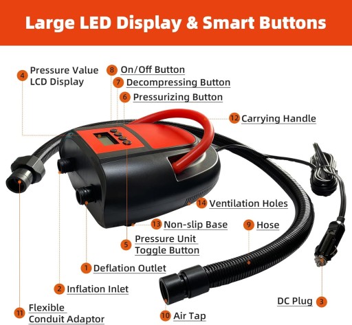【Швидке надування та перенесення】Накачування менш ніж за 1-2 хвилини, що швидше та зручніше, ніж надування вручну. Наш електричний повітряний насос SUP легко упаковувати та носити, і ним може керувати одна людина. 【Автомобільний роз’єм 12 В постійного струму та повний комплект насадок】Підключіть пристрій до роз’єму 12 В постійного струму у вашому автомобілі. Має запобіжник на 12 А для додаткової безпеки. З повним набором насадок для більшості надувних продуктів високого тиску, таких як надувна дошка для веслування, м’яч для йоги, надувний намет, надувний матрац, надувні водні продукти тощо. Двоступенева функція автоматичного відключення: 1. Рівень максимальної швидкості при 350 л/хв і 2. Максимальний рівень тиску при 70 л/хв. Функція автоматичного відключення вимикає насос, коли досягається цільовий тиск під час надування. 【Цифровий дисплей із моніторингом тиску в режимі реального часу】Цей електричний насос для веслування дошки оснащений датчиком PSI з точністю до 0,01 psi. Використовуйте цифровий дисплей, щоб встановити бажаний тиск і контролювати тиск у реальному часі. 【Автоматична система охолодження】Надуває 3 дошки до 20 psi, ідеально підходить для сімейних і групових подорожей. Охолоджується автоматично з першої секунди надування. Насолоджуйтесь тонким насосом для падлборду зі швидким накачуванням під високим тиском і постійною системою охолодження.