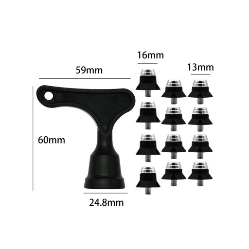 [ПАКЕТ]: Ви отримаєте 12 шипів для взуття (8 шипів 13 мм, 4 шпильки 16 мм, 1 шт. гайкового ключа), яких достатньо, щоб замінити старі або пошкоджені шипи у ваших футбольних бутсах.