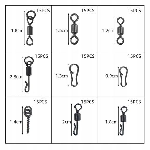В упаковці 30 насадок проти сплутування (S L); 15хВертлюг з кільцями; 15x швидкозмінний вертлюг з кільцями; 15x вертлюги з великим вушком; 30x поворотні вертлюги (S L); 30xШвидкозмінні поворотні пристрої (S L); 30x Link Swivel Quick changes (S L); 15 гвинтів для наживки для бойлів; 20 намистин для риболовлі; 100x намистин для фіксації гачків