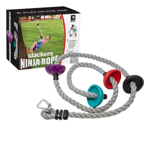 Мотузка для скелелазіння SLACKERS Ninja Rope – це стійка до атмосферних впливів мотузка довжиною 2,5 м і товщиною 3 см, яка має 4 круглі сходинки на відстані 45 см одна від одної. Мотузку можна легко прикріпити до Ninjaline, каркасів-гойдалок, будиночків на деревах або гілок за допомогою металевого карабіна, який входить у комплект.
