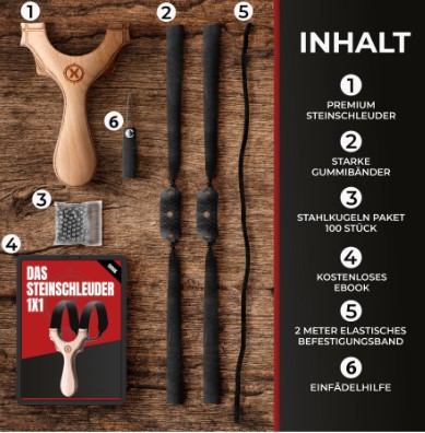 Кожна з наших рогаток поставляється в зручному наборі, тому ви можете почати використовувати свою рогатку відразу. У набір входять дві попередньо зв'язані гумки, 100 сталевих кульок (діаметром 8 мм), 2 м гумок для версій OTT і TTF і допоміжний пристрій для закріплення гумки. Також додається посібник користувача німецькою мовою з відеоуроками.