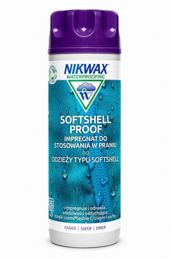 Nikwax SoftShell Proof™ Wash-In можна легко та швидко наносити в пральну машину, а його унікальні водовідштовхувальні властивості (DWR) активуються під час висихання на повітрі. Нанесення засобу під час прання в пральній машині гарантує, що засіб пройде крізь одяг, досягне швів, стрічок і тканини. Крім того, оскільки більше не потрібно сушити одяг у сушильній машині, енергія зберігається, і навіть найделікатніший, старий одяг захищений від впливу гарячого повітря. Nikwax SoftShell Proof™ Wash-In був спеціально розроблений і оптимізований для одягу softshell; він залишає гнучкий гідрофобний шар на окремих волокнах, який дозволяє парам вологи виходити, зберігаючи дихаючі властивості.
