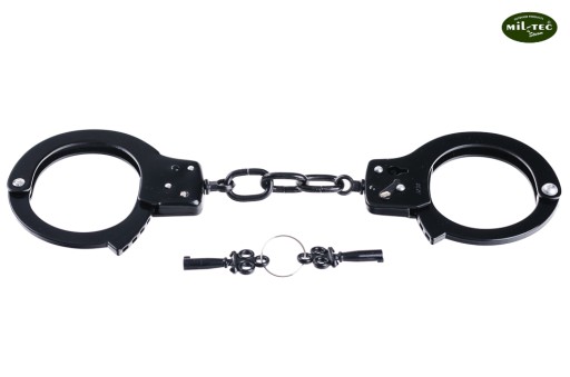 Суцільні наручники від німецької компанії Mil-Tec. Повністю виготовлений з нікельованої сталі. Нікель як гальванічне покриття робить сталь стійкою до корозії та надає їй характерного блиску. Ланцюг із загартованих ланок важко розірвати. Довжина ланцюга обмежує свободу рухів кінцівок закутого в наручники. Точний механізм гарантує відсутність застрягань. Оснащений системою блокування СТОП від обжиму. Механізми розміщені в корпусі з товстого листового металу, з’єднаного сталевими заклепками. Тугий замок із центральним штифтом ускладнює злам. Великий отвір вміщує зап’ястя навіть великої людини. Серійний номер вибитий на кожній частині. Два ключі в комплекті. Наручники запаковані в оригінальну коробку.