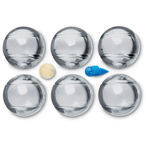 У набір входять 6 блискучих хромованих кульок (73 мм, вага: 720 г), маркер із шнурком для вимірювання відстані та дерев'яна кулька. Все це помістили в футляр.