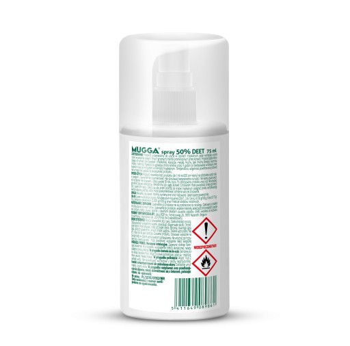 Mugga® Spray не подразнює шкіру та не спричиняє забруднення, але його не слід наносити на порізи, рани чи подразнену шкіру. У разі нанесення на обличчя, спочатку розпиліть руки, а потім розподіліть препарат по шкірі обличчя.