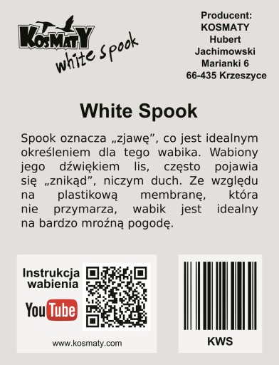 Приманка KOSMATY White Spook виготовляється методом обкатки в поліаміді. На відміну від дерева, поліамід гарантує повну повторюваність приманки, оскільки не змінює щільність під впливом вологи та температури. Завдяки цьому інструмент не деформується і не виникає ударів повітря між язичком і стінками гнізда, в яке він вставлений. Поворот, у свою чергу, забезпечує однакову щільність стінок інструменту по периметру. Це призводить до великого резонансу, якого неможливо досягти за допомогою машин для лиття під тиском.