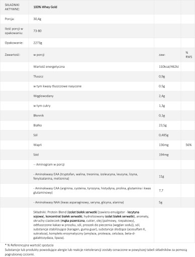 Інгредієнти Whey Gold Standard: суміш сироваткових білків (98%) [молоко] (ізолят сироваткового білка, концентрат сироваткового білка, гідролізований ізолят сироваткового білка, емульгатор: соєвий лецитин), ароматизатори, хлорид натрію, загусник (ксантанова камедь), підсолоджувач (сукралоза) , барвник (куркумін).