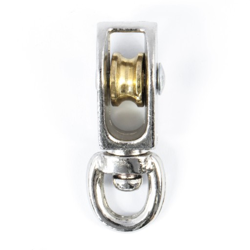 Поворотний шків канатний нікельований з одним колесом і вертлюгом, призначений для ручного підйому і навішування вантажів за допомогою канатів.