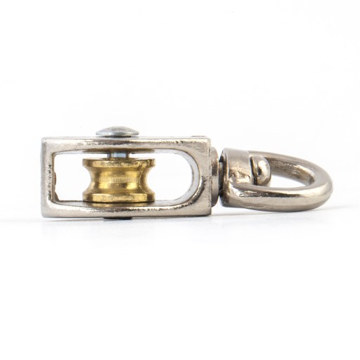 Поворотний шків канатний нікельований з одним колесом і вертлюгом, призначений для ручного підйому і навішування вантажів за допомогою канатів.