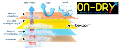 Високоякісний багатошаровий матеріал, який захищає взуття від намокання і відводить надлишки поту за межі взуття, що забезпечує відчуття комфорту в будь-яких умовах і покращує гігієнічні параметри взуття. ON DRY забезпечує повітропроникність 12 000 г/м2/24 і водонепроникність до 20 000 мм.