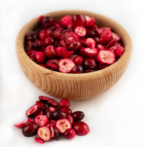 Продукт без додавання цукру. Без консервантів. Завдяки процесу сублімації плоди журавлини зберігають первісну форму, колір, аромат і приблизно 95% усіх цінних поживних речовин.