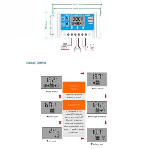 На дисплеї контролера можна спостерігати поточну напругу зарядки акумулятора та задавати/вибирати режим роботи з гелевими, кислотними та AGM акумуляторами, а також вручну програмувати налаштування напруги та час перемикання виходу.