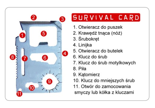 Карта має цілих 11 функцій, в т.ч ніж, пила, викрутка, гайкові ключі 4-10 мм, лінійка, відкривачка для консервів, відкривачка для пляшок.