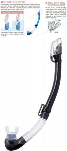 Трубка TUSA HYPERDRY ELITE SP-0101 з гіпоалергенним силіконовим мундштуком, що забезпечує комфорт використання, і верхнім клапаном HYPERDRY ELITE, який запобігає заливанню труби водою під час повного занурення.