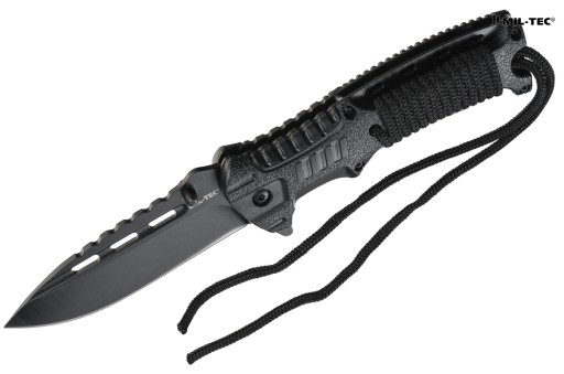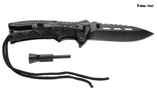 Легкий туристичний ніж з особливостями виживання. Продукт німецького бренду Mil-Tec. Оснащений розпалювачем, свистком і шматком мотузки. Ніж оснащений системою швидкого відкривання та застібкою на ремінь. Ніж легкий і компактний, рекомендований для туризму і повсякденного використання.