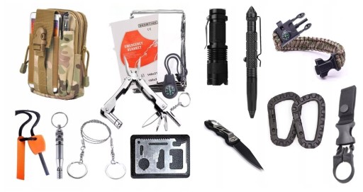 Набір для виживання з місткою сумкою, яку можна розмістити на поясі, рюкзаку або повісити на карабін.