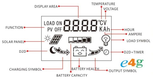 Цей контролер має функцію регулювання освітлення за часом після настання темряви, сонячне світло не потрапляє на сонячні батареї, а перемикач активує вихід постійного струму на певний період часу. Він також працює в ручному режимі, контролюючи процес розряду акумулятора.