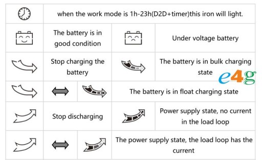 На дисплеї контролера можна спостерігати поточну напругу зарядки акумулятора та задавати/вибирати режим роботи з гелевими, кислотними та AGM акумуляторами, а також вручну програмувати налаштування напруги та час перемикання виходу.