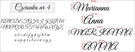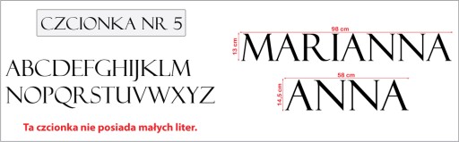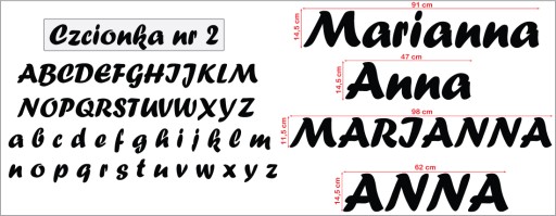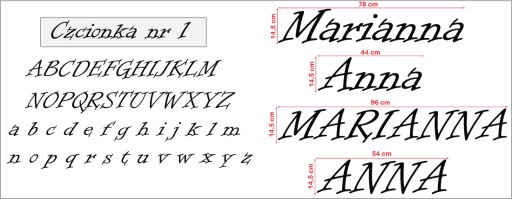 Ви отримаєте 2 однакові наклейки висотою макс. 14,5 см і довжиною макс. 98 см - якщо текст довгий, щоб помістити його на аркуш, мені доведеться зменшити його висоту - як на візуалізаціях нижче - наприклад, шрифт № 2 текст: MARIANNA.