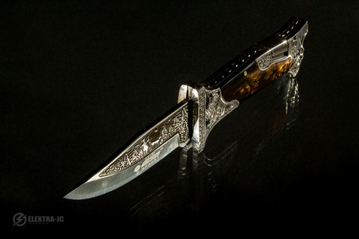 Ручка виготовлена з декорованої нержавіючої сталі та дерева. Ніж чудово лежить у руці та дуже гострий.