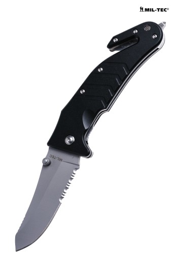 Міцний ніж для парамедиків. Продукт німецької компанії Mil-Tec. Модель, створена за суворими специфікаціями - надійна. Необхідне спорядження сучасного рятувальника. Незамінний в машині, дуже практичний. Компактні розміри, невелика вага та практичний затиск для кріплення полегшують транспортування. Торець ручки оснащений ломом для загартованого та клеєного скла. Лезо для швидкого розрізання ременів безпеки, кабелів і тросов.