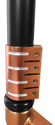 Y-подібне кермо, виготовлене з хромованої сталі, надає скутеру більшої жорсткості та забезпечує більшу довговічність, ніж алюмінієве кермо. Зручні ручки з високоякісної гуми забезпечують надійне захоплення, комфорт і безпеку Оснащений затискачем, що з'єднує сталеву вилку з кермом за допомогою 4 болтів, виготовлених з анодованого алюмінію з ЧПУ. Хомут відповідає за якість з'єднання цих двох елементів, настільки важливих в трюкових самокатах.