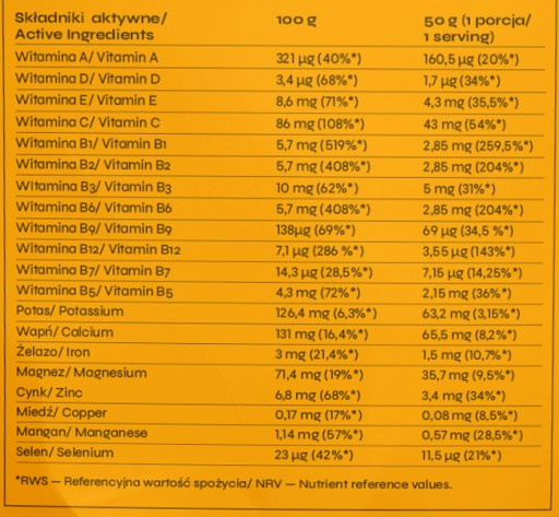 - Віт. D: 1,7 мкг (34%) / 3,4 мкг (68%)