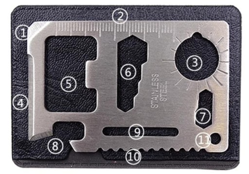 - МУЛЬТИІНСТРУМЕНТ: плоскогубці, пилка по дереву, відкривачка для пляшок, ніж, хрестова викрутка