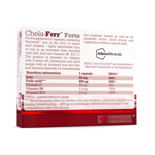 CHELA-FERR® FORTE – це дієтична добавка, що містить залізо Ferrochel® у формі хелату амінокислоти Albion® (дигліцинат заліза), форму заліза, що добре засвоюється та добре переноситься, у передовому комплексі з фолієвою кислотою та вітамінами: C, B6 , B12.