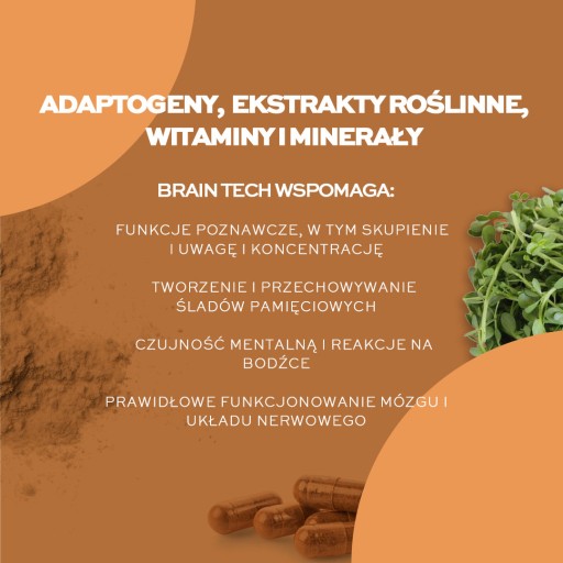 Brain Tech - це ретельно розроблена суміш натуральних рослинних екстрактів, підібраних таким чином, щоб підтримувати когнітивні процеси і таким чином підвищувати ефективність виконуваних завдань.