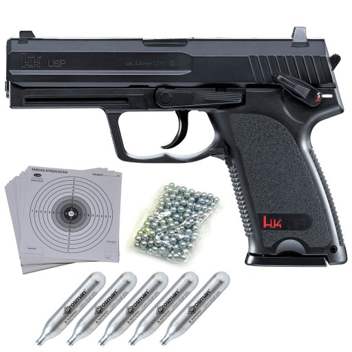 Пневматичний пістолет Heckler & Koch USP з металу та пластику. Гармата стріляє кулями BB (4,46 мм). Приводом є 12-грамовий картридж з CO2, розміщений у магазині, який містить 22 кульки. Пістолет і магазин мають ліцензійне маркування Heckler & Koch.