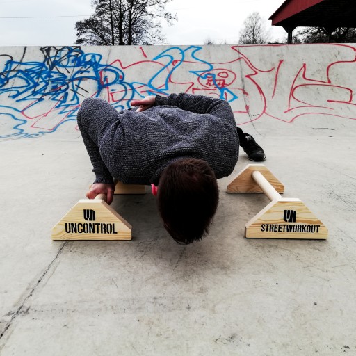 Професійні дерев’яні поручні/паралелі для занять спортом, стріт-воркауту та художньої гімнастики (набір з 2 шт.). Виготовлений дбайливо, естетично і завдяки підвищеній міцності. З одного боку напис UNCONTROL, з іншого – STREET WORKOUT.