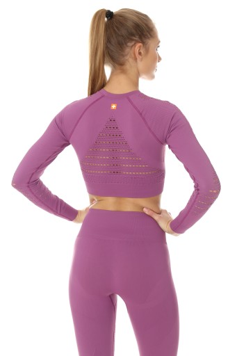 Більш тонкий трикотаж з сітчастою структурою в місцях підвищеного потовиділення додатково підвищує ефективність відведення вологи. Спеціальні зони RIB гарантують, що кроп-топ ідеально прилягає до тіла, підкреслює фігуру і не сковує рухів.