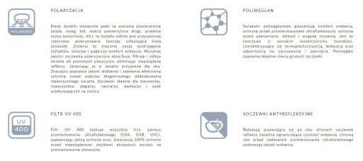 Чому варто вибрати поляризаційні сонцезахисні окуляри? Поляризаційні лінзи гарантують спостереження за навколишнім середовищем без дратівливих відблисків, з підвищеним контрастом і виділеними чіткими кольорами, але без їх спотворення. Вони чудово захищають ваші очі під час сильного сонячного світла. Поляризаційні лінзи завдяки своїй конструкції усувають відблиски світла, спричинені сонячним світлом, що відбивається від поверхні води, снігу, скла та металу.