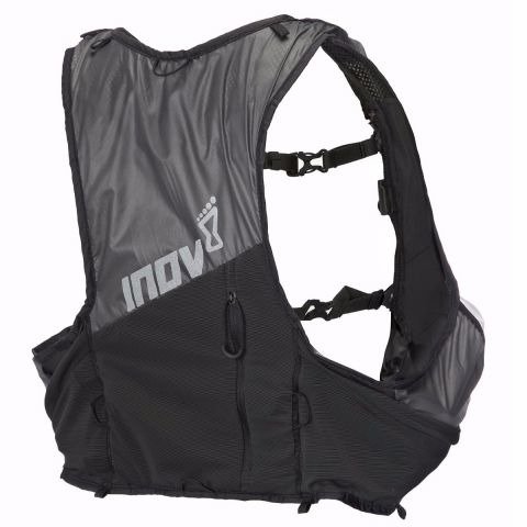 Еволюція inov-8 Race Ultra Vest 5 і 10. Два рюкзаки в одному - зменшений змагальний жилет із можливістю прикріпити 15-літрову кишеню на блискавці ззаду, коли вам потрібен більший рюкзак для тривалих подорожей. 6 ремінців, що кріплять основну кишеню, не дають їй підстрибувати під час бігу, сама додаткова сумка має дві еластичні кишені з боків і компресійні шнури. На самому жилеті є кишеня для ємності з водою, а також кишеня на блискавці з еластичного матеріалу внизу спини, який обов'язково підійде під куртку. Всього спереду 4 кишені (2 для м'яких колб, 1 на блискавці) і дві широкі кишені з боків з еластичної сітки зі шнурами. Жилет виготовлений з надлегких, міцних матеріалів, частково водонепроникних.