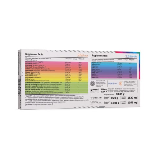 Vita-Min Multiple Sport - це дві зручні для ковтання капсули, в які фахівці лабораторії Olimp вклали мікроелементи, необхідні для нормального функціонування організму. Біла капсула VITA - PLEX SPORT® містить цілий ряд цінних вітамінів (A, C, D, E і групи B), підкріплених натуральними, безпечними для використання рослинними екстрактами (цитрусові біофлавоноїди, артишок, зелений чай, кислота ALA і піперин). ), посилюючи дію добавки.дієти. Синя капсула CHELA-MIN SPORT® містить необхідні мінерали (включаючи магній, кальцій, калій, цинк, залізо), які знаходяться у формі хелатів амінокислот Albion, які добре засвоюються.