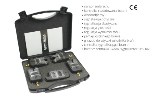 Бездротова панель керування Mistrall, що містить 4 водонепроникні сирени та панель керування з гучномовцем. Радіус дії приладу - 100м. Звукова, світлова та вібраційна сигналізація. Сигналізатори з регульованою гучністю, чутливістю і тонами. Сигналізатори обладнані виходами для свингерів. Контрольна панель живиться від маленьких пальчиків AAA x 3, а сирени живляться від батарейок 6LR61 (прямокутних 9 В), по одній для кожної сирени. Набір упакований в елегантну валізу, обшиту губкою.