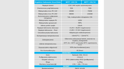 Контролери зарядки SmartSolar MPPT 100/50 з точкою відстеження максимальної потужності від фотомодулів є ідеальним рішенням для сонячних батарей з вхідною напругою до 100 В постійного струму та вихідною напругою: 12 та 24 В. Використання цих регуляторів дозволяє підібрати будь-які фотомодулі.