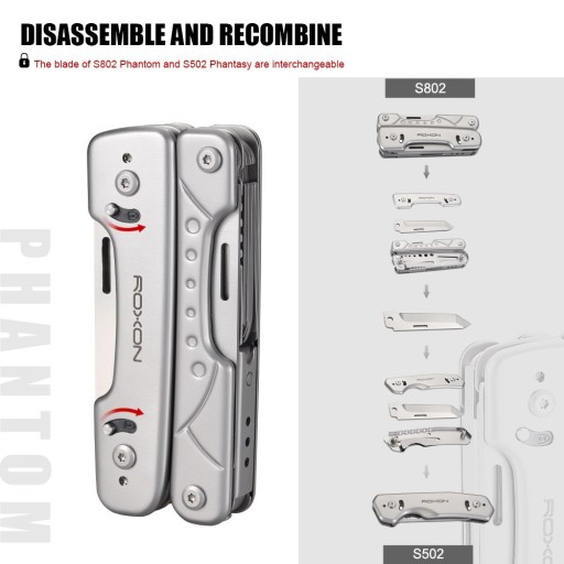 - Мультитул Roxon S802 має змінне лезо ножа та різак для дроту. Лезо ножа можна змінити на інший тип леза для різних потреб. Оригінальне лезо в S802 Phantom - American Tanto, якщо вам потрібні інші лезо, купуйте їх окремо.