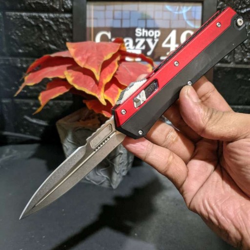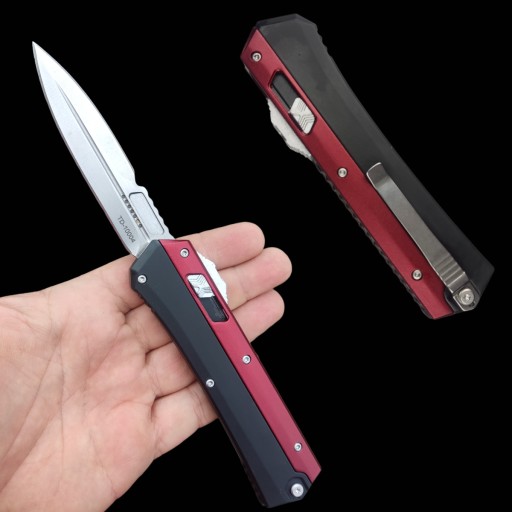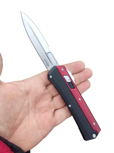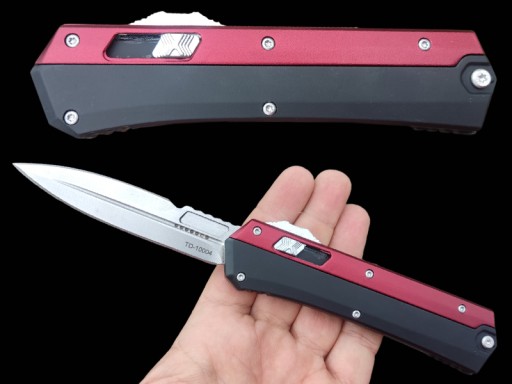 Пружинний ніж типу OTF (з лезом, що висувається спереду), який автоматично висувається і втягується в металевій ручці
