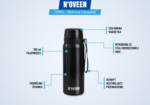 Термос Noveen створений для зручного та естетичного зберігання ваших улюблених напоїв. Зберігаючи високу і низьку температуру напоїв, термос корисний цілий рік, незалежно від погоди. Він виготовлений з матеріалів, які не містять BPA.