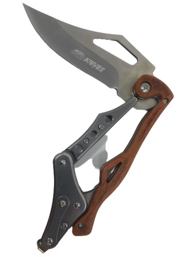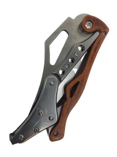 Лезо ножа виготовлено з нержавіючої сталі, рукоятка виготовлена з металу та дерева. Завдяки використаним матеріалам і кільцю, ніж надійно тримається в руці. Має фіксатор леза. На задній частині ручки є затискач для носіння на поясі. Ніж новий та гострий.