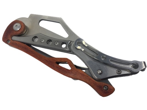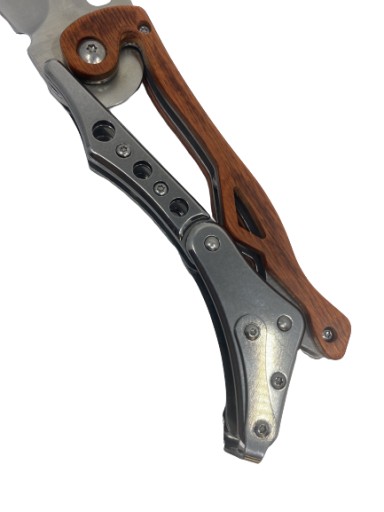 Ніж оснащений оригінальним механізмом складання, який дозволяє складати його натисканням на задній механізм розблокування.