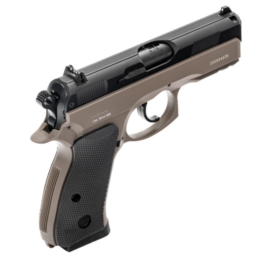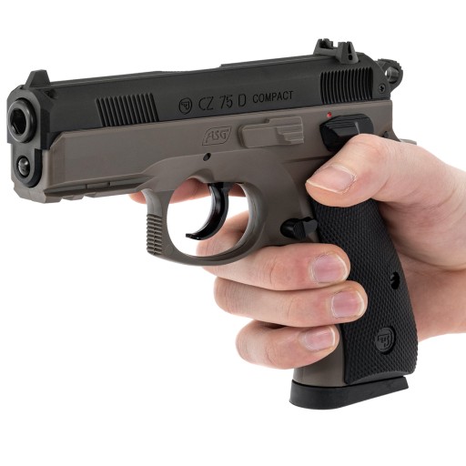 Копія пружинного пістолета CZ 75D виготовлена з пластику. На пістолетну рукоятку нанесено текстурування, яке запобігає ковзанню пістолета в руці. На казенній частині нанесено маркування виробника оригіналу вогнепальної зброї.